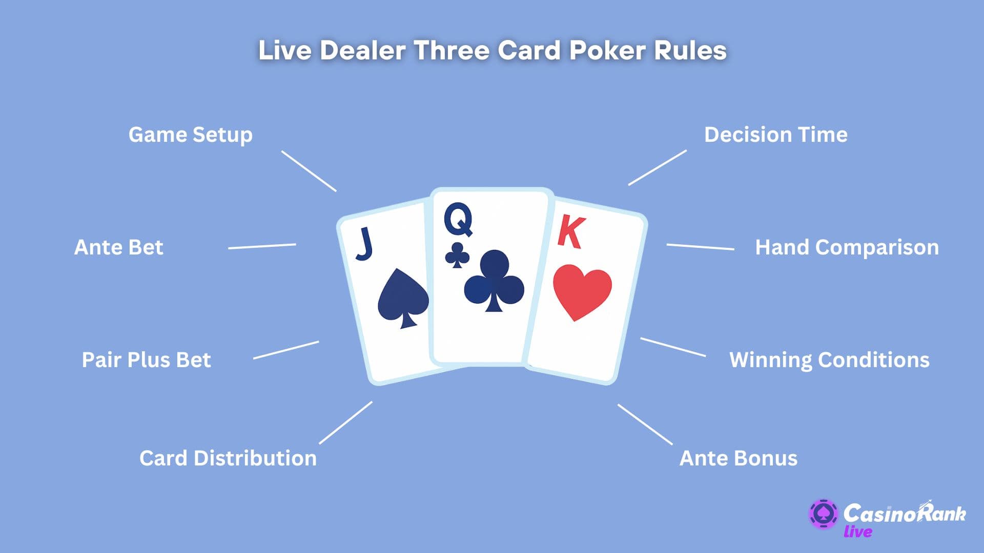Comprender las reglas del Póker de Tres Cartas es esencial antes de sumergirse en el juego en vivo. La belleza de este juego radica en su simplicidad combinada con elementos estratégicos. Aquí hay un desglose completo de cómo jugar:
